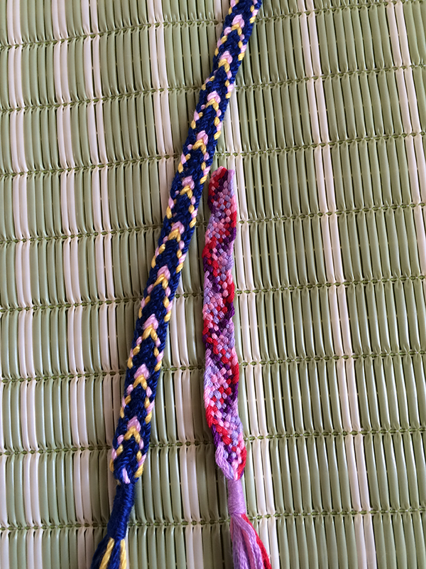 紐を組むときに、同じ強さで糸を引っ張らないといけないのですが、その手加減が難しいのです。